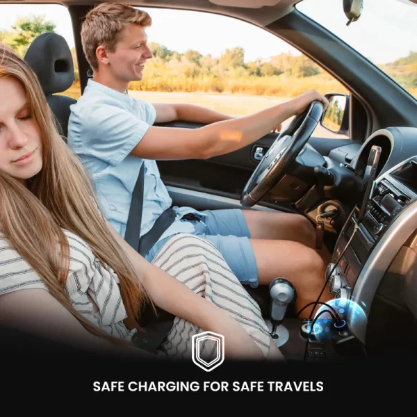 - The 60W car Charger boasts a compact design. It seamlessly fits into the car’s power socket.